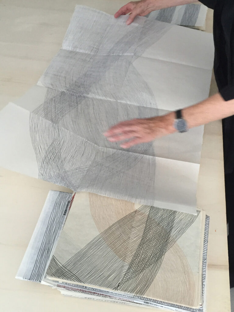Titel: »ENTFALTEN, FALTEN, ENTFALTEN …«, Performance, WKV Stuttgart, 28.8. und 9.9.2015 Serie: Unterwegszeichnungen Jahr: 2017 Kategorien: Zeichnung Technik: Tusche auf Japanpapier Größe: 96 x 62 cm Galerie: Walter Bischoff Galerie Preis: auf Nachfrage
