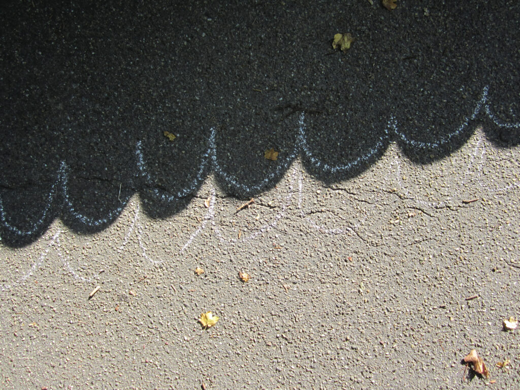 Titel: Schatten Serie: Asphaltzeichnungen, Auflage 6 Jahr: 2012 Kategorien: Fotografie Technik: Farbfotografie, Kreide auf Asphalt Größe: variabel Galerie: Walter Bischoff Galerie Preis: auf Nachfrage